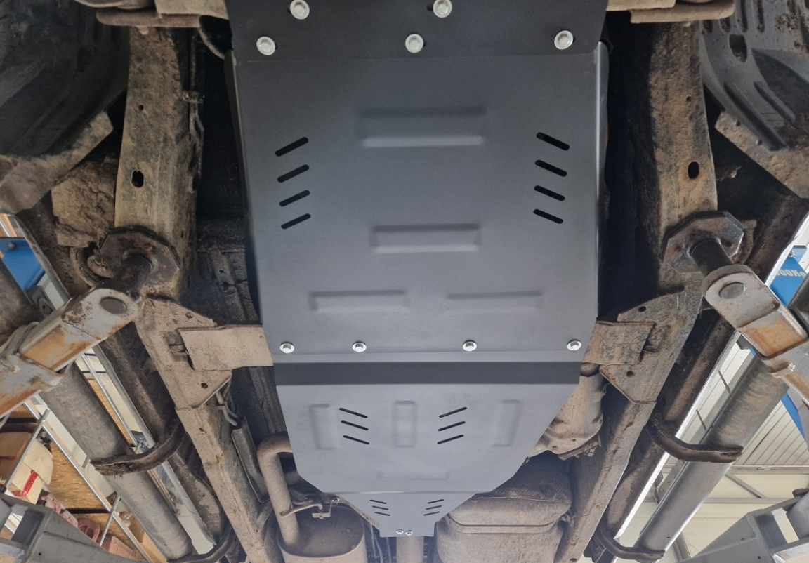Le cache métallique protège: la boîte de vitesses, boite de transfert Le cache de protection est réalisé en Acier thermolaqué avec une épaisseur de 3 mm. Vis, écrous, pinces, tous les accessoires de fixation sont inclus. Toutes les plaques de protection sont revêtues de poudre pour prévenir la corrosion. L'extérieur de la plaque de protection est doté de renforts en Acier thermolaqué, ce qui augmente la résistance aux chocs. |